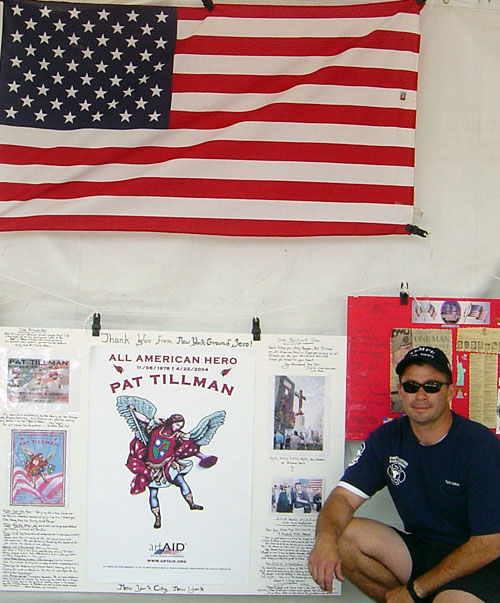 The ArtAID Pat Tillman Memorial prints hang at the temporary Arizona Memorial installation. Banners were posted and remembrance cards were given to the Tillman Family by local residents (thanks Barb).