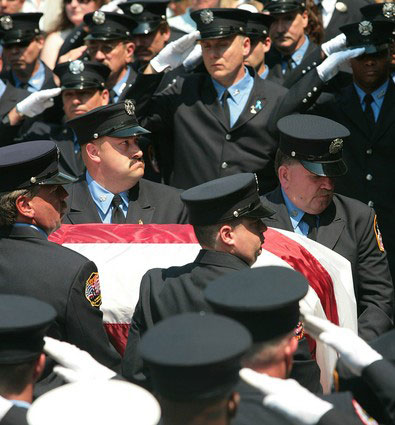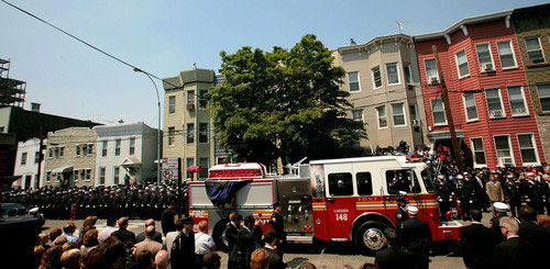 Lining up in the hundreds in dress blue uniforms outside the parish church of fallen New York City firefighter Daniel Pujdak, his comrades stood in formal uniform in ninety degrees plus for his funeral Tuesday morning in Greenpoint. The sounds of Emerald Society bagpipes came from the parish auditorium beside St. Cecilia's Roman Catholic Church where an honor guard of four firefighters stood at the doors.